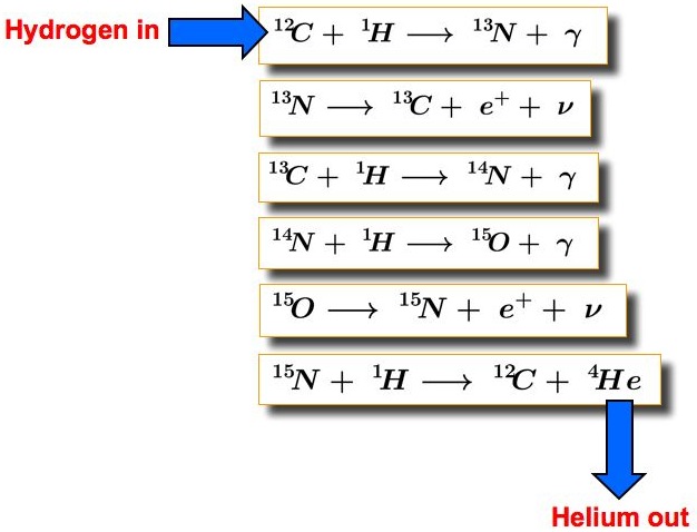 HOPE IT HELPS YOU. Also because the steps involve protons fusing with carbon and heavier nuclei the CNO cycle requires a much higher temperature to overcome the strong Coulomb barrier. As you did with the proton-proton chain determine the net equation for the CNO cycle.